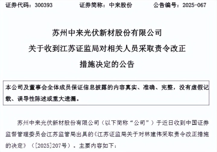 12月15日晚,苏州中来光伏新材股份有限公司(300393.SZ,以下简称“中来股份”)发布公告称,副董事长兼总经理林建伟因未履行私募基金差额补足承诺,收到江苏证监局出具的责令改正措施决定,相关违规行为已记入证券期货市场诚信档案,截至目前尚有1.77亿元补偿款未支付。